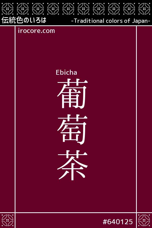 葡萄茶(えびちゃ)とは、やや紫を帯びた暗い赤色のことです。葡萄酒の色をさす英語の色名ワインレッド(wine-red)に近い色です。 名前の由来は山葡萄(やまぶどう)の一種ののエビカズラからですが、伊勢海老の甲羅の色に由来する海老色(蝦色)と両者の色が近いことと葡萄(えび)と海老(えび)と音が通じるため、近年では混同されるようになりました。