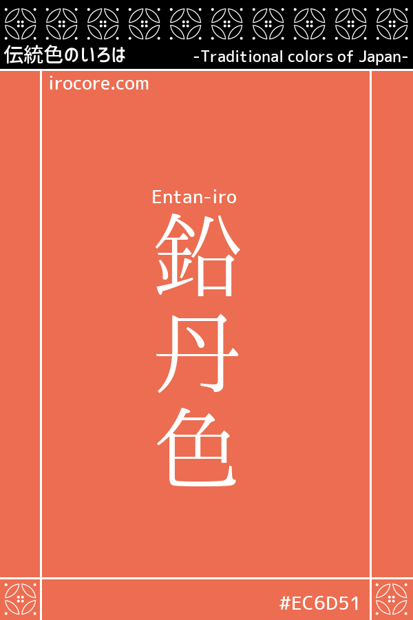 The Entan-iro, It is a bright orange that was strongly slight redness of lead oxide. Bright red, with red lead with a different name. It is also the function of the anti-corruption and anti-corrosive, sometimes color red had revered Takashi further, red lead was used in the primer, such as a building, including the shrines and temples. In addition, also known as one of the oldest pigment, it's stored in Shosoin.