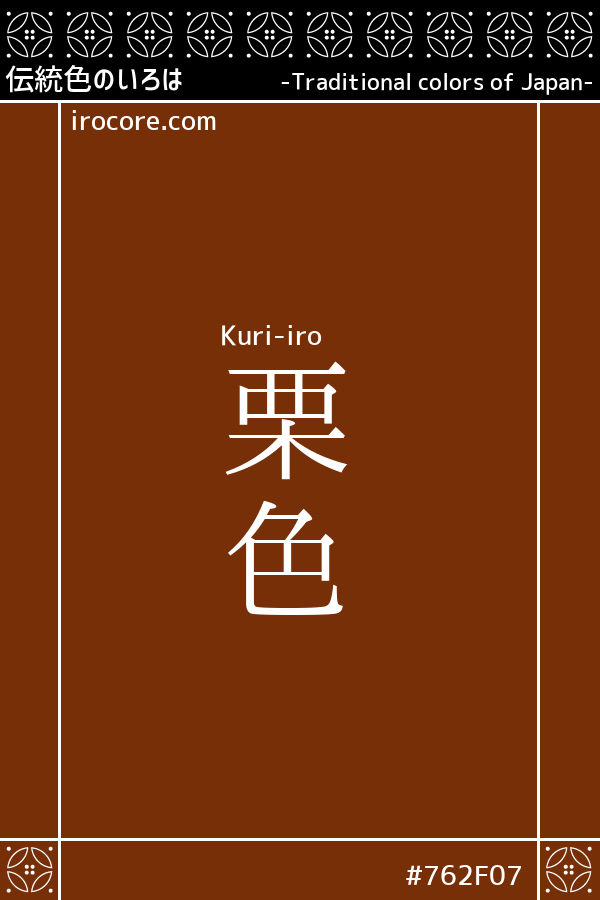 The Kuri-iro, by the dark brown color of redness of the skin, such as chestnut, The Ochikuri-iro is also known. Chestnut fruit and bark is also a dyed material, but it refers to the color of the skin of the fruit of the chestnut rather than that of staining. By the way, is also known as the color of the hair color epithet or call and the horse Kurige dark brown, Kuri-iro and referred to as the color of the hair.