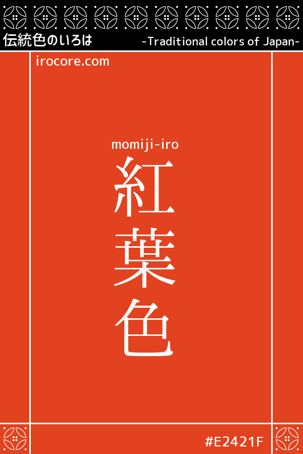 紅葉色(もみじいろ)とは、晩秋の赤く色づく楓 のようなあざやかな赤色のことです。 古くからの色名で、もとは平安装束の重 ねの色目『紅葉 』に由来しています。