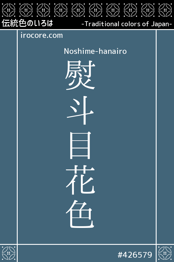 Noshime-hanairo, it is a dark blue strong Hai-mi than Noshime-iro. It is written as "not so and so and Noshime-hanairo color Masuhana-iro, of SanMasu TokoroYoshimi, the Job" of the Edo period to the "hand mirror pattern Setsuyo". It should be noted that the crest of Ichikawa Danjuro and three bushel, color name of Masuhana-iro thing thin flower color Go-sei-dan Juro favored. My name is "Noshimehanairo" the color of dark indigo than that.