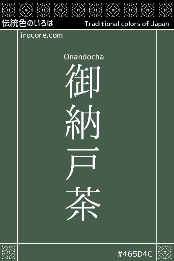 According to the collected essays of the Edo period, where for cloth Aimirucha many years, had been closed to the NAND is, had discolored but it was stylish very colors and began to sell as "Onandocha" this and was all the rage are marked.Color of brown that was popular as forty-eight tea in the Edo period is divided into three lineages Hazel derived from the color "crop", "powdered tea" and "green tea", yellow tea, blue tea but, Onandocha is strange of Sencha I will hit the color phase.