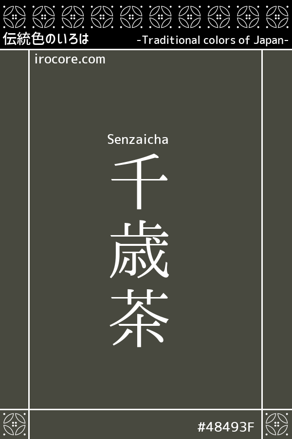 千歳茶(せんざいちゃ)とは、千歳緑を茶色がからせた暗い緑褐色のことで、「千哉」「千才」「仙斎」とも書かれます。江戸時代には「四十八茶百鼠」といわれたように、様々な中間色が出揃いましたが、媚茶などと同じく千歳茶のような黄緑系の渋い中間色も茶と呼ばれていました。文政の頃には、婦人の紬の紋付に用いられたほか、男子の木綿にも使われていたようです。
