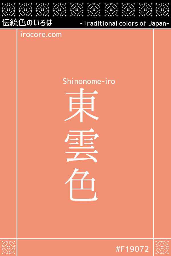 東雲色(しののめいろ)とは、夜が明け始めるころ太陽で白み始める東の空を思わせる明るい黄赤色のことです。曙色とも呼ばれます。東雲は現在でいう、網戸の網目にあたるものを、篠笹(しのざさ)で作っていたので、「篠の目(しののめ)」といったそうです。東の雲が薄いピンクに染まり、真っ暗な室内に「篠の目」から明かりが差し込んだことから、“東雲色”を「しののめいろ」と呼ぶようになったようです。