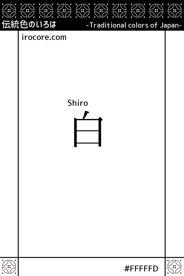 The Shiro, is one of the oldest among the color name in Japan, and is a color that appears on the surface of a human thing that reflects all of the light is perceived. White achromatic, is a Taigo of black, it was used as the first words to distinguish colors. History books of the oldest "But Kojiki", White has appeared alongside black, red, and blue.