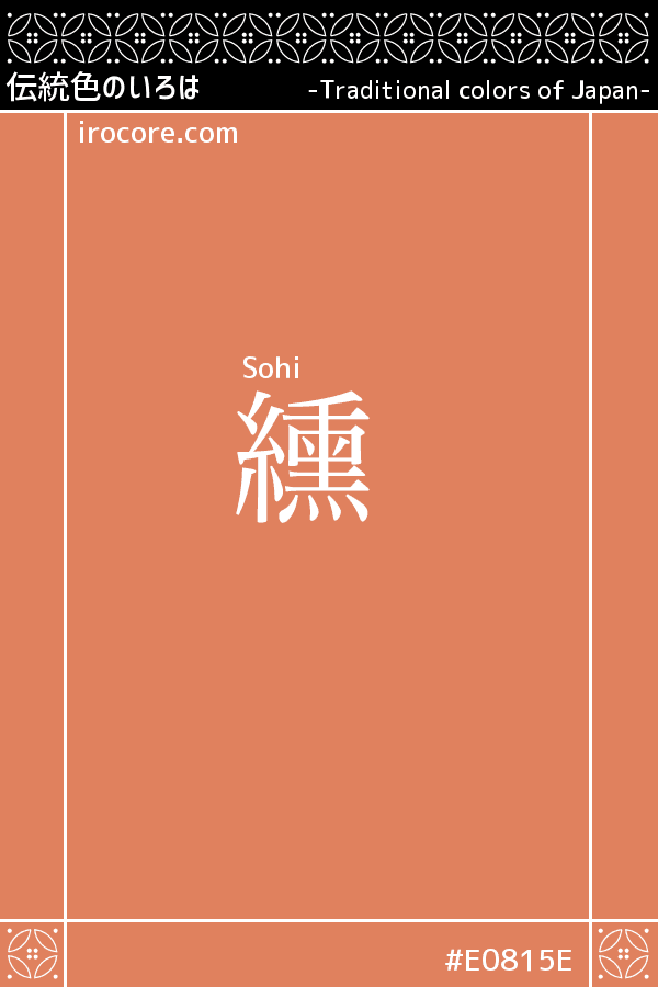 The Sohi, it is a bright red-orange dyed by lye by mordant and madder. A little thinner than the scarlet of the same madder dyed, it is the color of the hierarchy below the scarlet in the order of dress color of the Nara period. You may also use a color name that was introduced from China, Chinese characters of "Su ratio" is expectation. There is also a record of named because it was similar to the color of the belly hair "Sobi (Hijaz Kingfisher)" of birds. The color name unfamiliar in modern times, but it is used for, such as Japanese sweets.