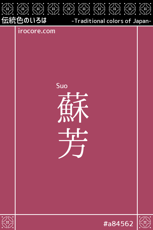 The Suoh is a reddish-purple color with blackish tints, and is dyed from the leguminous plant "Suoh". It has been used as a color name since ancient times, and the characters "Suho" and "Sofang Suo" are also used. In Japan, Suho has been imported since ancient times, and was a valuable commodity, as shown by its name on the Shosoin treasures.