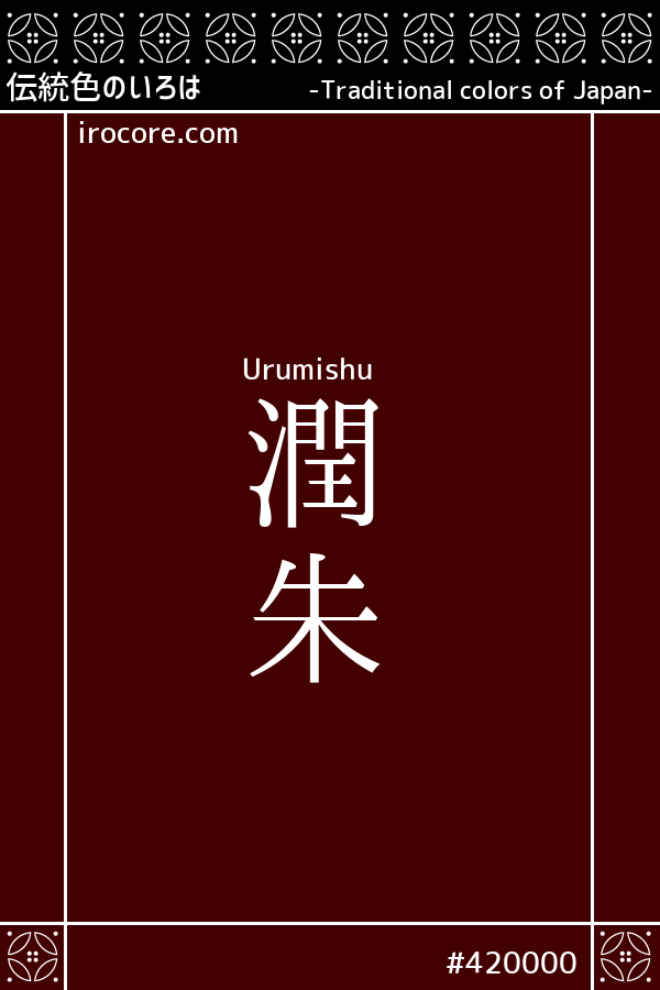 潤朱(うるみしゅ)とは、彩漆 の一種である潤み朱塗 の色のような深く渋い赤色のことです。黒みを帯びた朱塗りの色を指し、『朱色 』の華やかさを抑えつつ、落ち着きと重厚感を兼ね備えた色調となっています。色名の「潤 む」という言葉には、うるおいを帯びて落ち着いた印象を与える意味があり、文字通り「潤 みの朱」という意味がそのまま名称となりました。