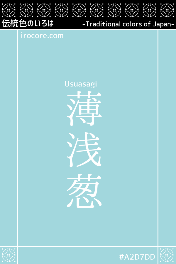 Usuasagi (薄浅葱) refers to a pale bluish-green color, derived from lightening the shade of Asagi-iro (浅葱色). It is also written as Awuasagi (淡浅葱). Asagi-iro is a traditional Japanese color dating back to the Heian period and was originally inspired by the color of young green onions (negi). However, it exhibits a lighter and more bluish tone than the actual plant.