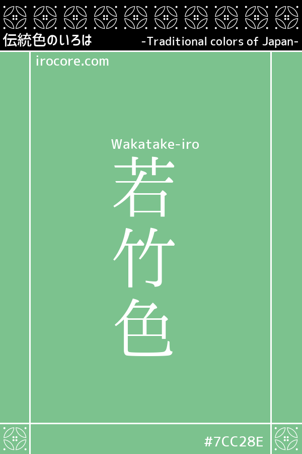 The Wakatake-iro is that of a refreshing green thin creamy as young bamboo. It represents the color of green bamboo younger than that of the green bamboo. I was also used as epithet of vividness from the sense that new youthful is "young". To emphasize the difference between youthful, be the color of light eyes more, bamboo was pretty bright color even when it is popular in the Taisho era. By the way, it will be "old bamboo color" When you green slow of you.