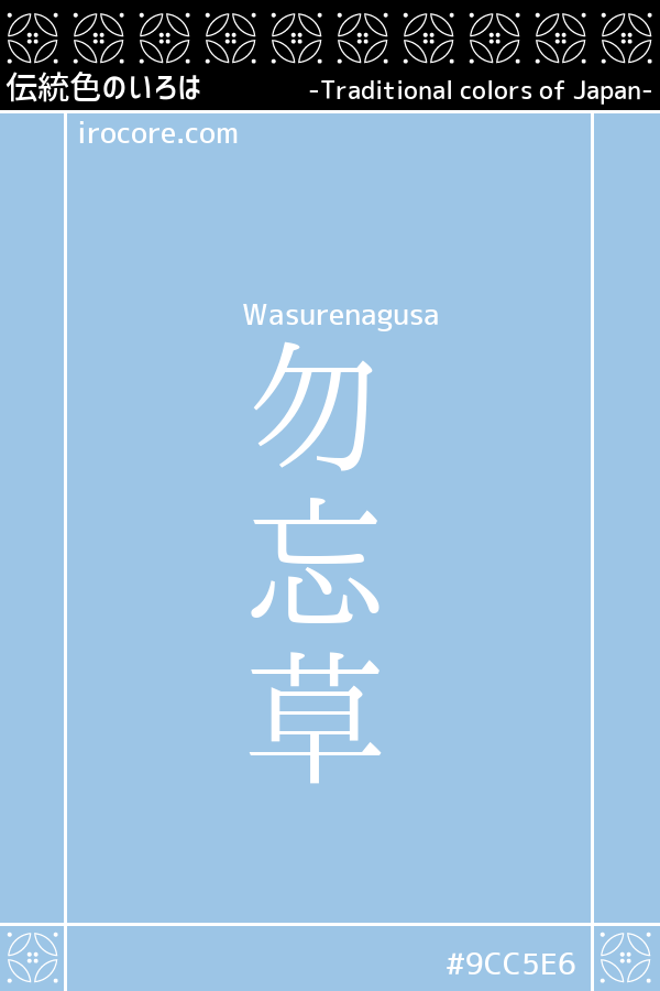 The Wasurenagusa, is a lovely bright blue, such as forget-me-not flowers. With the new color name from the Meiji period, derived from the legend of the German "Forget-Me-Not" Japanese translation. Been "Wasurenagusa" is the introduction of the German poet Wilhelm Arendt in Ueda Satoshiyaku "Kaichouon", it is also said to have become as flower name, to be known as the name of the color.